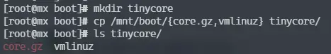 如此,我们就知道如何启动 Tiny Core Linux 了。然后将 core.gz 和 vmlinuz 放到/boot 下(最好新建一个目录)
