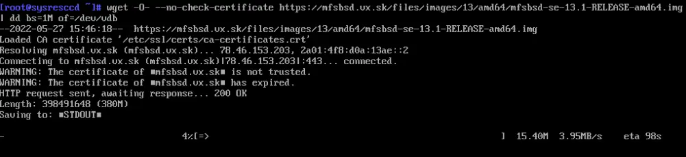 完成后(停止救援并)重启,进入 mfsBSD。但因为 mfsBSD 是 copy-to-ram,所以还不能直接投入生产,需要再次安装。